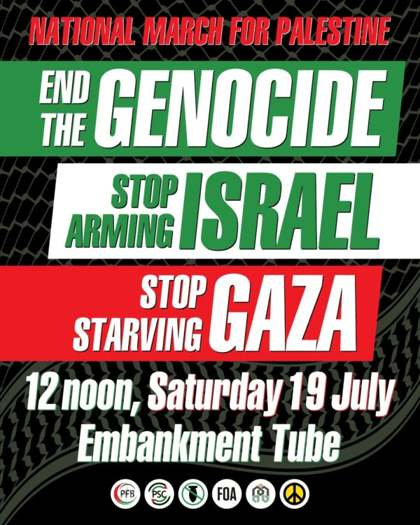 The latest National March for Palestine, organised by Palestine Solidarity Campaign and its allies takes place on 19 July in London.  The pressure on the British government to stop arming Israel and stop the starvation in Gaza must continue.